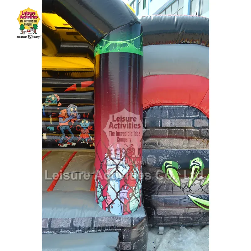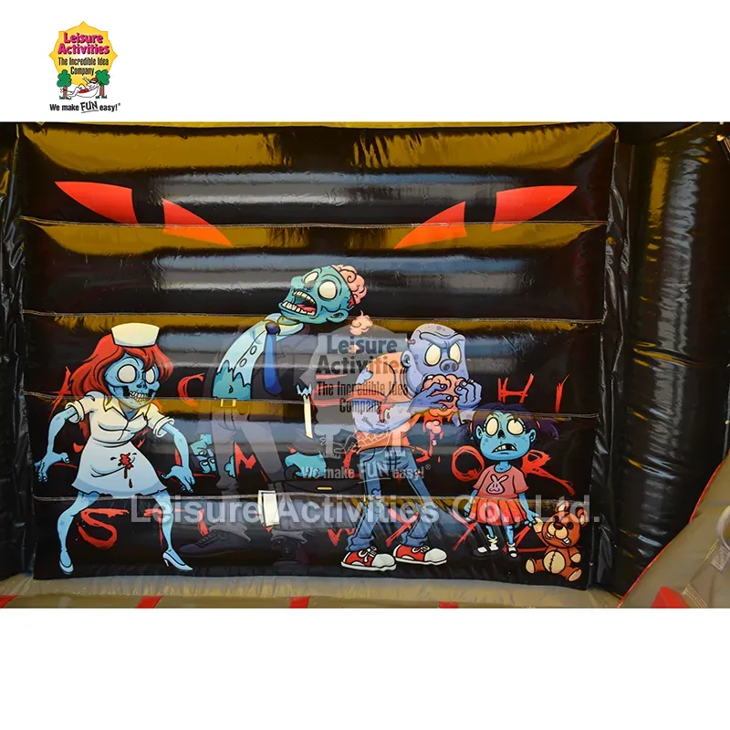 Slayd ilə Haunted Kiçik Şişmə Çoxoyunlu Qala Qalaları: Bu Zombi temalı "Haunted Combo" şişmə uşaqları həyəcanlandıran cizgi filmi-dəhşət estetikası ilə ovsunlamaq üçün nəzərdə tutulmuşdur. Cəsarətli qırmızıların, parlaq qaraların, qorxunc yaşıl və mavilərin cəsarətli birləşməsi canlı, həyəcan verici bir mühit yaradır. Tibb bacısı, beyin yeyən personaj və oyuncaq ayı ilə zombi uşaq kimi dinamik pozalarda cizgi filmi zombilərinin böyük, oynaq qrafikası qorxudan daha çox əyləncəlidir. Damda sürünən iri mavi zombi, divarların arasından süzülən caynaqlı əllər və sütunlardakı zəncirlər/qrafiklər kimi interaktiv elementlər yaradıcı oyuna səbəb olur. Qoruyucu üst örtüyü olan qapalı struktur kölgə və yüngül yağışdan qorunma təmin edir, qapalı sürüşmə isə macəraya əlavə olunur. 10 fut hündürlüyü onu həm qapalı, həm də açıq havada istifadə üçün çox yönlü edir, Halloween şənlikləri, payız festivalları, temalı ad günü tədbirləri və qorxunc həyət əyləncəsi üçün mükəmməl uyğunlaşır.